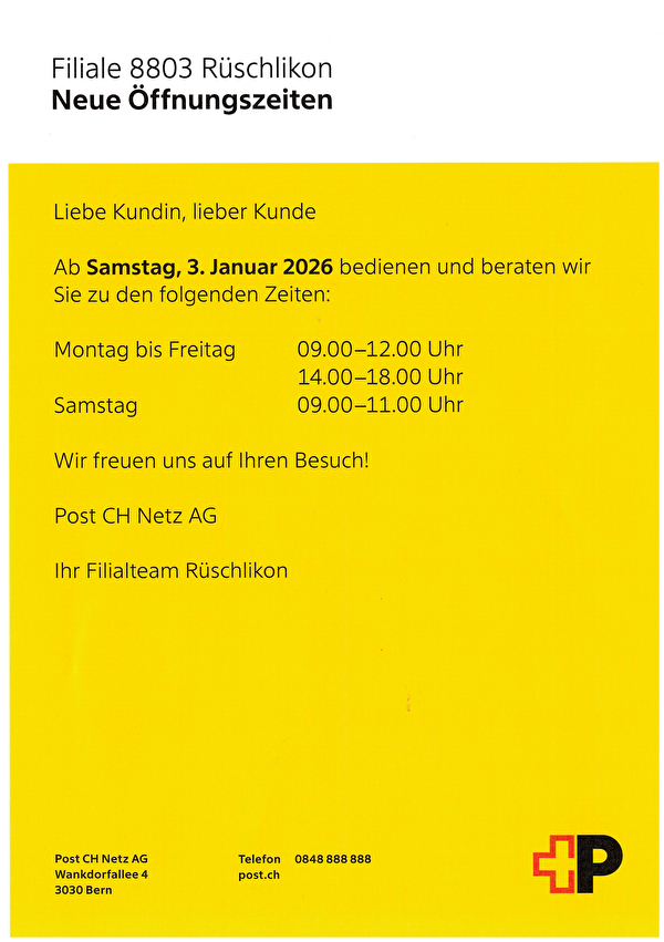 Die Post ändert die Öffnungszeiten der Postfiliale Rüschlikon:
